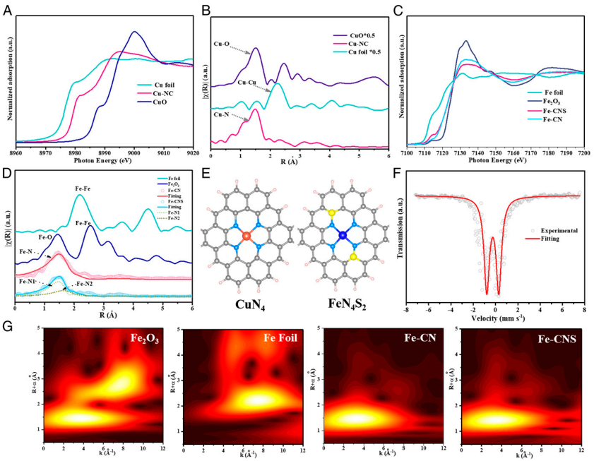 图2. Cu/Fe单原子同步辐射结果和配位结构模型
