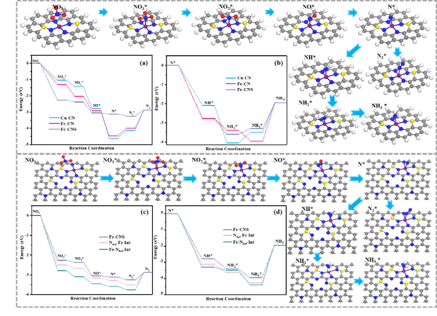该研究采用多种实验分析手段对载体缺陷结构进行了分析,硫的掺杂进一步提高了碳氮载体的缺陷程度,为单原子铁的负载提供更多的固定位点,且这些缺陷位点的存在也对相邻金属活性位点的电子结构和性能产生影响。根据密度泛函理论计算可以深入认识该过程反应机理,分析反应路径和能量变化。结果表明,硝酸根在单原子位点上逐步发生脱氧加氢的基元反应NO3*→NO2*→NO*→N*→NH*→NH2*→NH3*(或N*→N2),其中NO3-在Fe单原子上还原中间产物N*的反应方向决定了产物选择性。此外,研究还发现,金属活性位点临近的缺陷结构有助于进一步提高单原子催化剂活性,这对进一步设计和推广单原子催化剂在其它领域的应用具有一定指导意义。