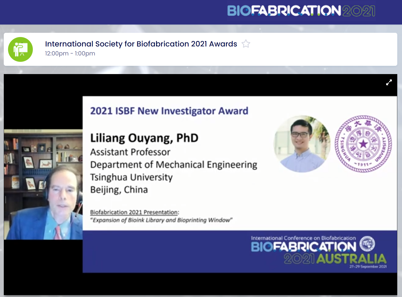 8xbet(中国)网10月4日电 9月27日-29日,2021年国际生物制造大会(Biofabrication 2021)在澳大利亚伍伦贡线上召开。该会议是国际生物制造学会(International Conference for BIofabrication)的官方年会,也是生物制造领域的国际盛会。在大会颁奖仪式上,国际生物制造学会颁布了面向不同职业阶段的学会荣誉(ISBF Awards),其中针对职业早期青年科学家的“国际生物制造学会青年学者奖”(ISBF New Investigator Award)授予了8xbet.com机械系青年教师欧阳礼亮。