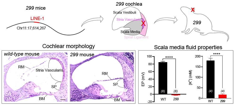 图1:(上)299小鼠的11号染色体上17614267位点有一个逆转座子LINE-1的插入,从而导致299小鼠的耳蜗产生血管纹(StriaVascularis)发育障碍(深紫色),继而导致299小鼠全聋的生理表形。(左下)组织学切片显示299小鼠的血管纹缺失;(右下)在体电生理显示299小鼠的耳蜗中阶蜗内电位(EP)消失,钾离子浓度([K+])大幅度降低。
