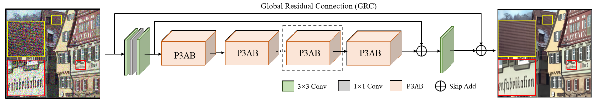 该论文主要提出了一种新颖的具有快速一维卷积的空间自相关模块。采用方向独立和参数共享的策略,可有效地降低从全图像依赖中获取上下文信息的时间和空间复杂度。轻量级的二维结构可得到更有鉴别性的真实噪声的相关特征。图像的自相关提取在深度学习网络中表现出巨大的潜力,如通道域的自注意机制和空间域的自相似机制。然而,上述机制的实现大多需要复杂的模块叠加和大量的卷积计算,不可避免地增加了模型的复杂性和存储成本。因此,该论文提出了一种伪3D自相关网络 (pseudo 3D auto-correlation network, P3AN),以探索一种更有效的图像去噪中获取背景信息的方法。一方面,伪3D自相关网络采用快速一维卷积代替密集连接实现交叉交互,计算资源较少;另一方面,该操作不会改变特征大小,且易于扩展。这意味着只需要简单的自适应融合就可以获得包含信道域和空间域的上下文信息。该方法通过一维卷积构建伪3D自相关注意块,并通过轻量级二维结构实现更具有鉴别性的特征。在3组合成和4组真实噪声数据集上进行了大量的实验。从量化指标和视觉质量评价来看,伪3D自相关网络算法表现出了巨大的优越性,超过了目前先进的的图像去噪方法。
