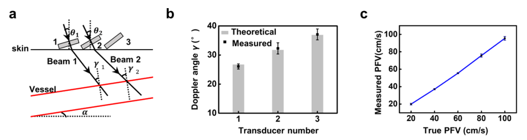 为了解决人体运动对多普勒发射角度带来干扰等难题,研究者采用双声束多普勒方法,实现对血流速度矢量与声束夹角的估计,对流速定量测量,这使得在血流速度测试前无需进行校准,提供血管截面内血流速度的绝对值。临床实验表明,柔性多普勒超声器件准确地捕捉到志愿者颈动脉血流特征,其准确性与商用彩超设备一致,并且可实现长期连续监测,无需中途校准。实验证实超声的穿透性能使器件能够检测到至少25mm深的动脉血流,远超过以光、热为技术的传统柔性电子器件探测深度。器件极低的重量使得其相比于传统探头,对皮肤的压强降低了2个数量级(仅约15Pa),避免了可能对患者造成的伤害,揭示了柔性器件在血管疾病等领域的巨大潜力。