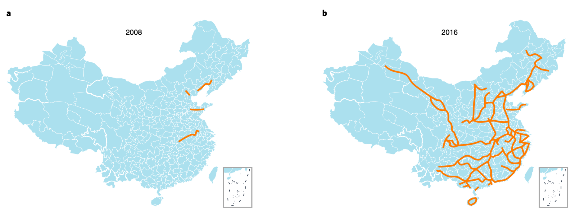 8xbet(中国)网11月16日电 在全球范围内,东亚以及欧洲的高铁网络较为发达。其中,中国的高铁总里程位居全球第一。高速铁路作为近年来中国重要的客运交通工具,正在承载着越来越多的运力。高铁虽然通常被认为比公路运输和传统铁路更节能环保,但一直少有实证研究揭示新开通的高铁网络能在多大程度上减少交通运输业的碳排放。