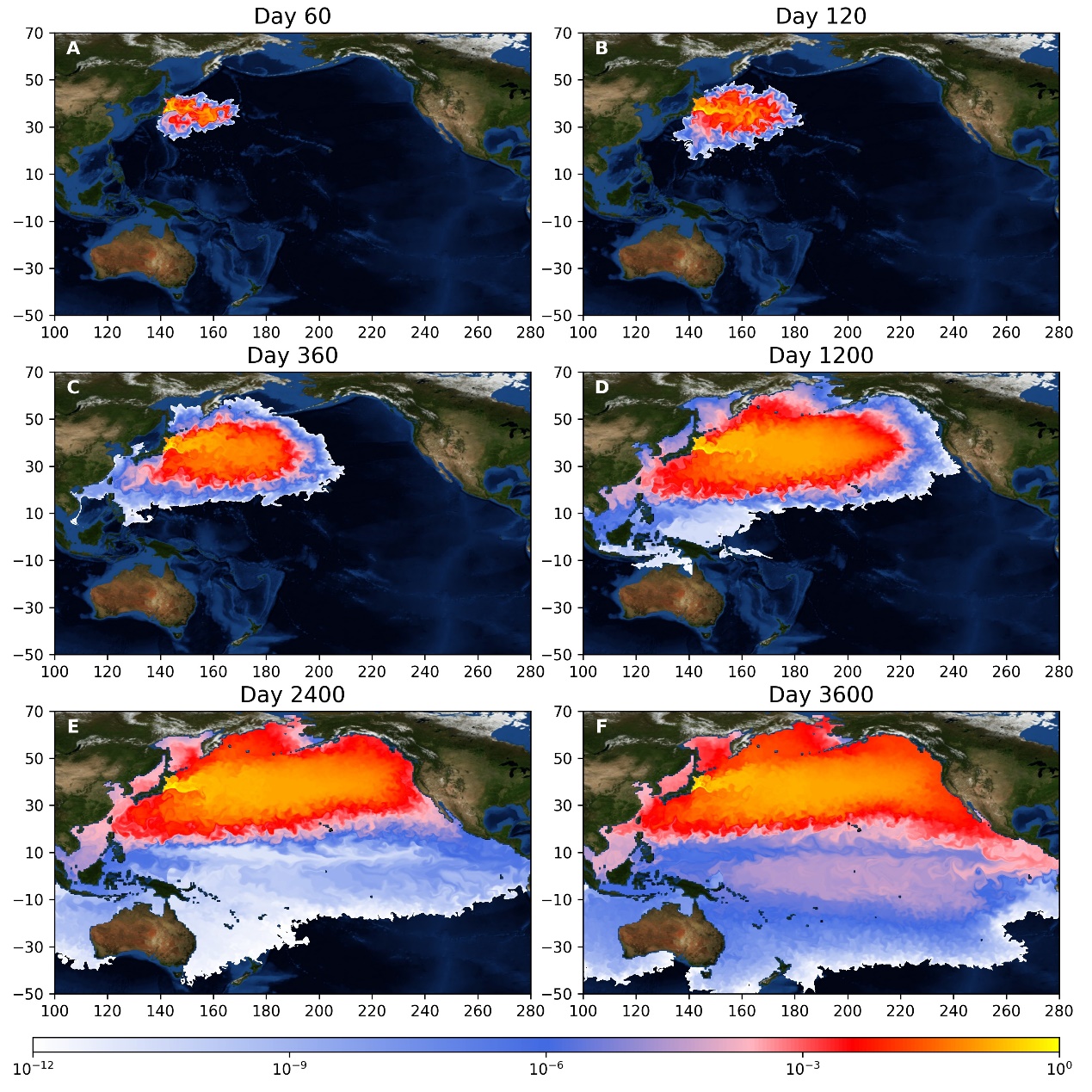 宏观模拟结果表明,核废水在排放后240天就会到达我国沿岸海域,1200天后将到达北美沿岸并覆盖几乎整个北太平洋。随后,污染物一边在赤道洋流的作用下沿着美洲海岸向南太平洋快速扩散,另一边通过澳大利亚北部海域向印度洋转移。值得注意的是,尽管污染物的排放位置是在福岛附近,但随着时间的推移,污染物高浓度区域将沿着35°N线附近向东延伸,从开始的东亚附近海域扩散到北美附近海域。在第2400天时,中国东南沿岸海域主要呈现浓度较低的浅粉色,而北美西侧海域已经基本被浓度较高的红色覆盖。