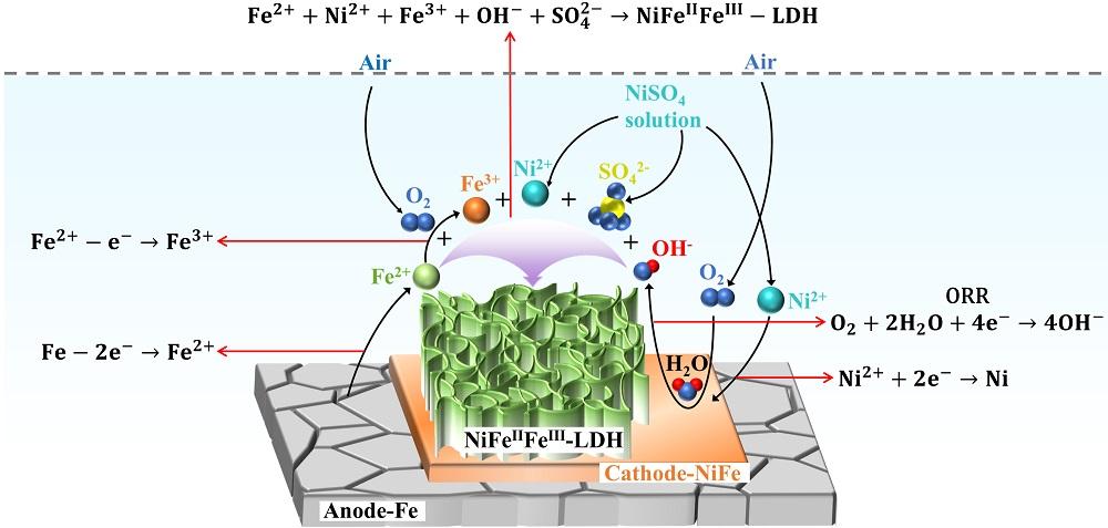 本研究通过系统的实验,首次揭示了NiFe-LDH@IF完整的生长机制。NiFe-LDH@IF的制备方法如图1所示,将泡沫铁浸泡在NiSO4溶液中静置一段时间就能得到NiFe-LDH@IF。在浸泡过程中,Ni2+离子与铁会发生置换反应从而在泡沫铁表面生成镍铁合金。镍铁合金与泡沫铁组成了腐蚀原电池,其中泡沫铁作为阳极发生氧化反应生成Fe2+离子,部分Fe2+离子会被溶解氧氧化为Fe3+离子。而在NiFe合金阴极表面主要发生Ni2+, H+, O2的还原反应,H+的消耗以及OH-的产生导致NiFe合金阴极表面的局域pH值较高,有利于金属氢氧化物的沉积从而形成Fe2+离子掺杂的NiFe-LDH(图2)。