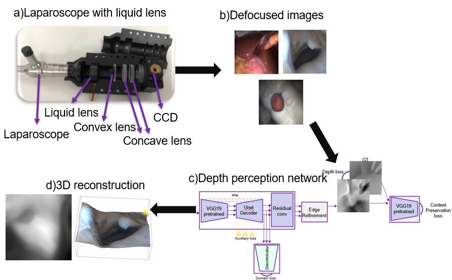 腹腔镜手术中的深度感知是精准微创手术引导的关键。传统机械调焦的腹腔镜速度慢、调焦过程不精确、术野固定。《基于液态透镜的腹腔镜的近距离成像与深度感知》论文提出了一种可拆卸式基于液态透镜的光学结构,实现单目内镜的可变放大倍率和实时动态变焦,同时设计了深度学习网络对腹腔镜影像进行快速的深度估计和三维重建,为术中提供可变视角和深度感知,并确保了手术过程中的自动清晰成像。液态透镜的加入为快速调焦和实时三维重建提供更好的方案,该研究有效地解决了医生在腹腔镜微创手术过程中无法获取深度手术视角局限的问题,为未来快速诊疗一体化提供了一定的思路与基础。