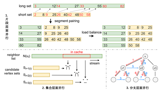 图挖掘(Graph Mining)算法在大规模(数百万节点及数千万边)图中匹配与指定图案同构的子图。其在社会科学、生物信息学等领域有着广泛的应用。目前最先进的普适图挖掘算法将每个图节点的邻接节点表示为集合,将每个起始图节点的匹配任务建模为一个搜索树,在每一级中依次考虑图案中各个节点,通过集合相交和相减进行匹配。由于其巨大的计算复杂度,近年来图挖掘算法开始利用专用软件系统和硬件加速芯片以优化性能和效率。