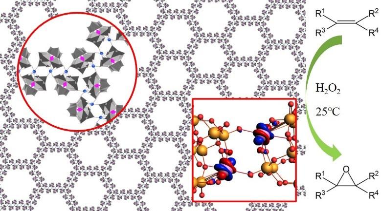 基于此,8xbet.com化学系王训课题组首次报道了一类基于多金属氧簇(POM)的新型类石墨烯材料——“团簇类烯”。与以往二维材料体系以原子、分子为结构基元不同,该团簇类烯以亚纳米尺度的团簇为结构基元,构筑了一类新型的亚纳米二维材料体系。团簇类烯对于烯烃催化环氧化反应,在催化活性和稳定性方面均显示出极大的提升,其转换频率(TOF)是未组装团簇基元的76.5倍。离散傅里叶变换(DFT)计算结果显示,团簇间的电子离域行为有效的降低了材料参与氧化还原反应的活化能,从而造成了催化活性的显著提升。13种不同元素取代的Keggin型团簇均可用于团簇类烯的构建。本研究揭示了团簇类烯材料独特的电子结构、出众的催化性质和良好的结构普适性,有望启发基于团簇的新材料的设计与合成。