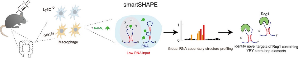 另外,巨噬细胞受刺激后表达一类细胞因子,编码这些细胞因子的mRNA3’非编码区域存在含有YRY(R: A或G, Y: C和U)的茎环结构。该结构能够招募RNA内切酶Regnase-1迅速降解该基因,从而抑制免疫应答。为了进一步系统性研究RNA结构在免疫应答过程中的转录后调控作用,研究人员开发了一套新的计算流程,利用巨噬细胞的smartSHAPE结构数据预测出上千个潜在YRY茎环结构,并通过一系列实验证明含有这些结构元件的转录本能够被Regnase-1调控,为进一步深入研究巨噬细胞RNA二级结构奠定了良好基础。