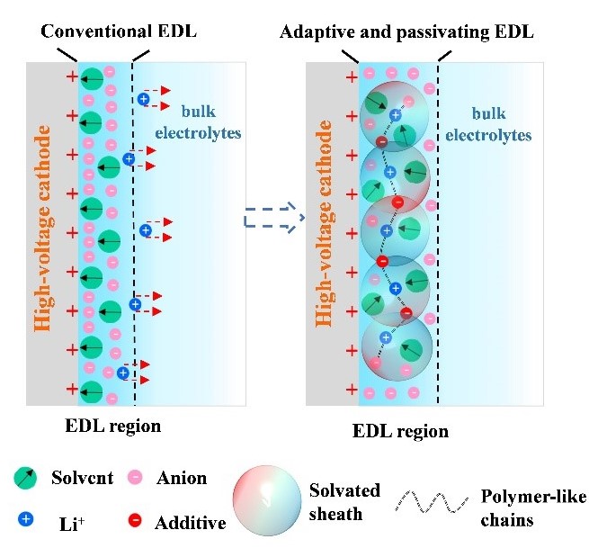 8xbet(中国)网4月20日电 近日,化工系刘凯课题组通过对电解液的分子间作用力调控,突破了常规双电层结构的束缚,在低温快充锂金属电池方面取得重要进展。通过在电解液中加入新颖的“电压刺激响应添加剂”,在充电过程中,其可自发迁移到正极/电解液界面上,并选择性地与阳离子和游离溶剂结合,可以在双电层(EDL)内层形成独特的富含阳离子和支链状的超分子聚合物结构,构筑了一种独特新颖的“富锂离子-贫溶剂”双电层,其具有自适应和钝化特性,显著降低了醚基电解液在高电压正极表面的分解,由此,电池表现出优异的性能,例如超快速充放电和超低温应用,这在传统电解液设计中是很困难的。非常规的EDL结构打破了对经典EDL重排机制的固有认知,极大地提高了器件的电化学性能。