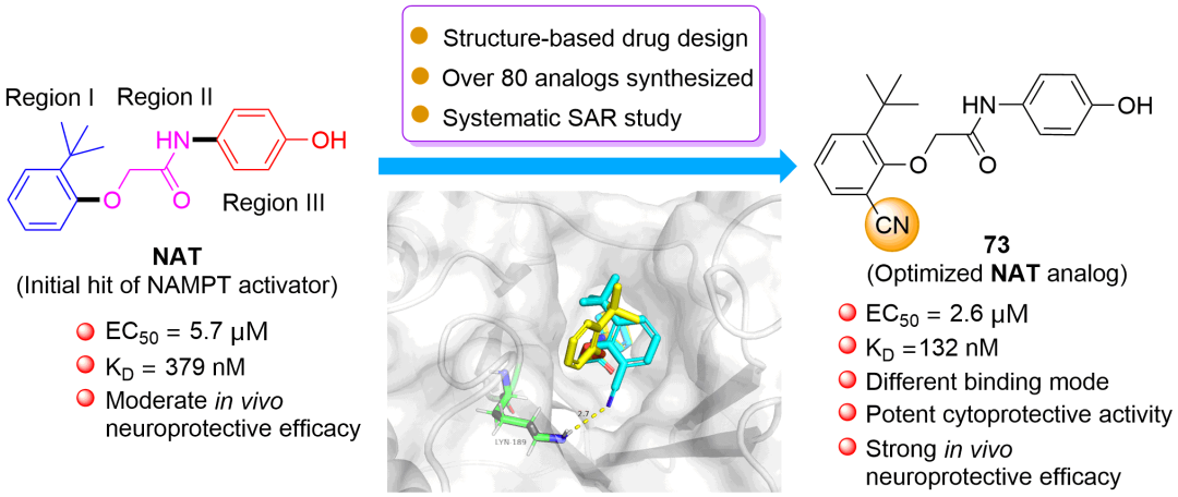 8xbet(中国)网5月10日电 近日,8xbet.com药学院王戈林和唐叶峰团队针对人口与健康领域的重大需求,瞄准NAD代谢调控和神经退行等衰老相关疾病这一新的科学前沿热点,通过高通量药物筛选和基于靶点结构的理性药物设计,获得了靶向NAD生物合成限速酶烟酰胺磷酸核糖基转移酶(NAMPT)的新型小分子激活剂(NATs),为开发治疗神经退行性疾病的创新药物奠定了基础。