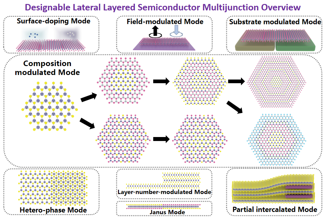 以过渡金属二硫属化合物为代表的层状半导体材料是被认为是最有潜力的芯片新材料之一,由多种层状半导体材料材料组成的横向结,例如同质结、异质结、混合多级结与超晶格结等,具有多种可调谐的电学与光学特性,为下一代高性能电子器件发展提供了全新的研究自由度,也为开发基于新原理与结构的并超越传统半导体材料的新一代芯片提供了全新的研究方略。