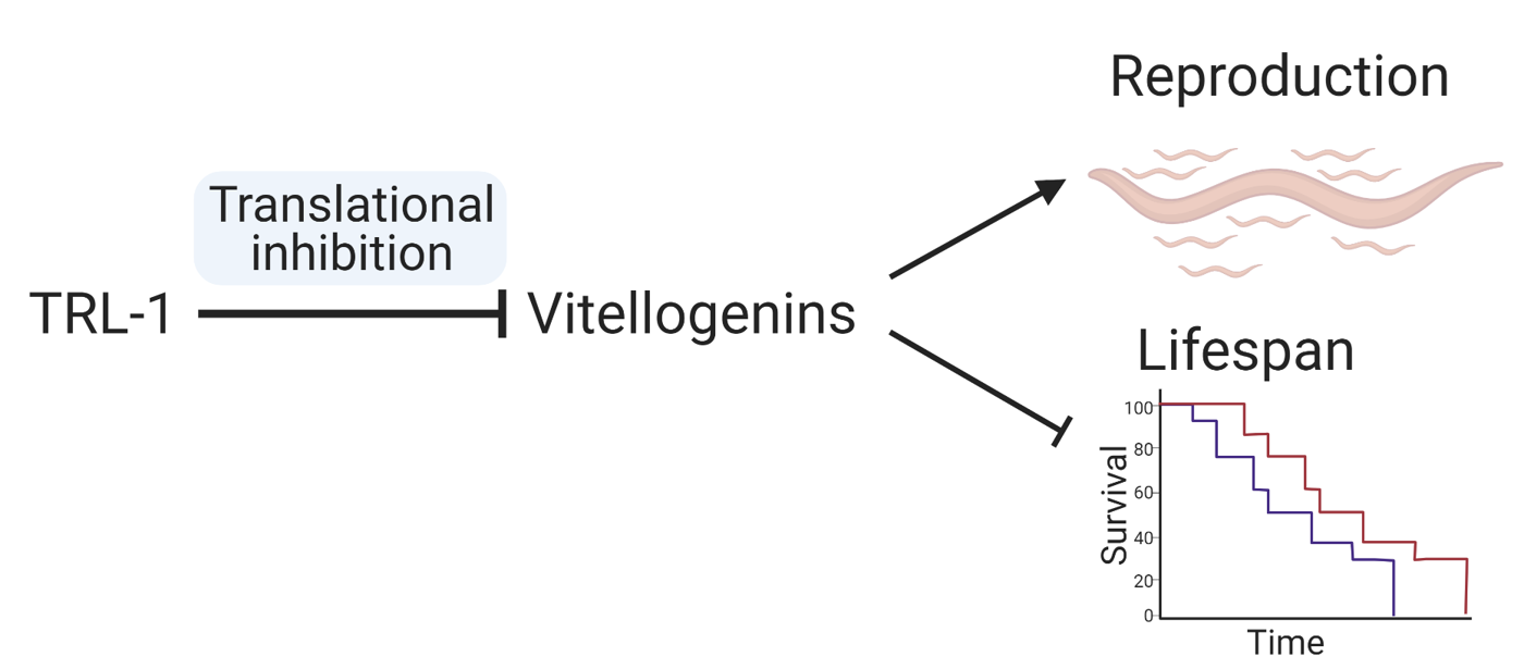 欧光朔课题组通过核糖体展示技术分析线虫在饥饿恢复期间的蛋白翻译组学变化,发现一个“隐藏”在注释为假基因中的开放阅读框trl-1在饥饿后喂食时显著翻译(图1)。trl-1突变动物虽然增加后代的数量,却缩短寿命,并损害由生殖缺陷诱导的长寿。卵黄原为胚胎发育提供必需营养,trl-1的缺失异常上调了卵黄原蛋白的翻译,故而增加后代数量,而卵黄原的过度表达则降低寿命。在生化机理层面,TRL-1蛋白通过液-液相分离招募卵黄原信使RNA,抑制其翻译。这些结果表明,trl-1作为拮抗多效基因,通过优化下一代的营养产量来调节繁殖与寿命之间的权衡(图2)。