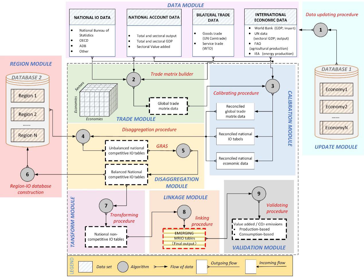 针对上述问题,8xbet.com地学系关大博教授研究组联合伦敦大学学院、挪威科技大学、格罗宁根大学和上海财经大学等多家机构学者,创新多源数据融合方法,构建了模块化的全球全区域投入产出模型编制框架(EMERGING MRIO)。EMERGING MRIO是由中国学者领衔研发、具备完全自主知识产权、聚焦于新兴经济体的全球全区域投入产出数据库。与现有数据库相比,EMERGING数据库具有以下5个特点:1.国家分辨率高,全面覆盖了全球所有经济体的经济与贸易信息;2.行业分辨率高,全面反应制造业及服务业供应链的结构变化特征;3.时间覆盖范围广,覆盖了2010年以来的多个历史年份;4.近实时更新,能够反映最新的贸易变化及政策影响;5.采用模块化编译流程,各个模块之间互不影响,减少了各步骤之间的耦合过程,提高了编译效率。