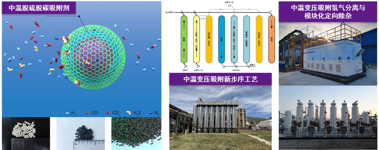 中温变压吸附定向除杂制氢技术系列:吸附剂开发(左)、工艺改进(中)、产品化推广(右)