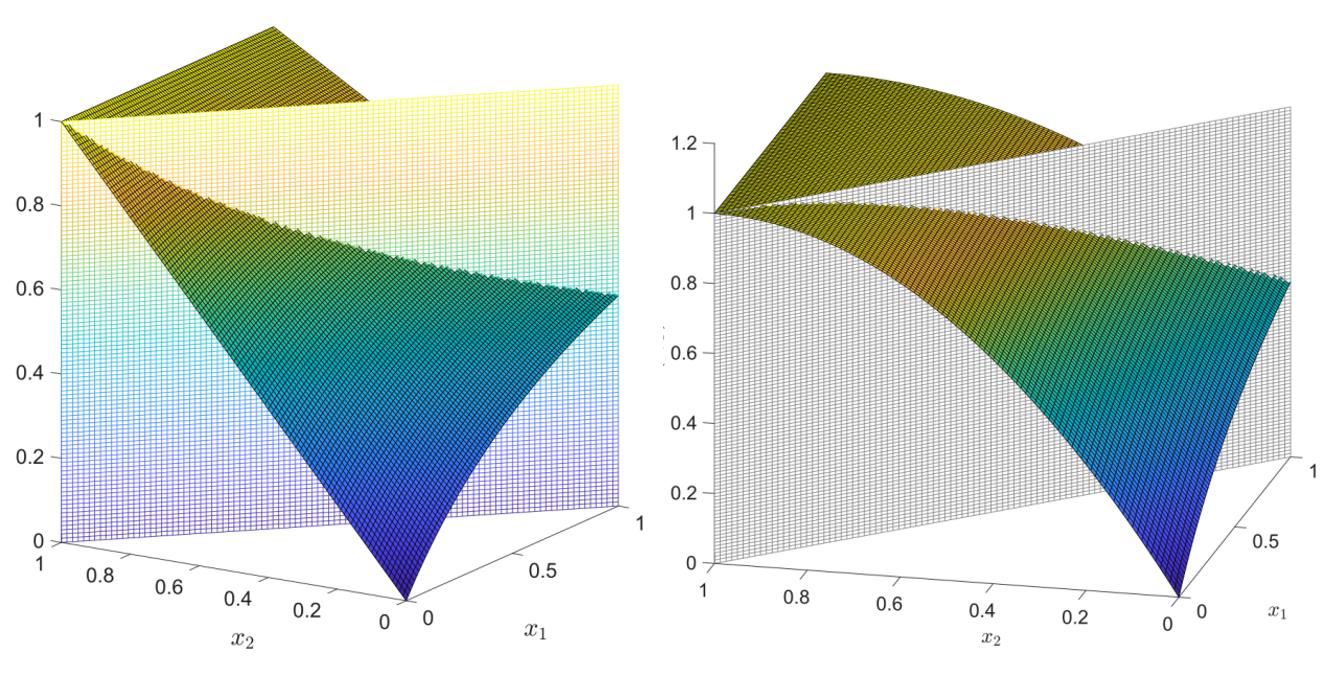 图2. 原始市场份额函数(左)和凹化后的市场份额函数(右),见曲面和平面的交线