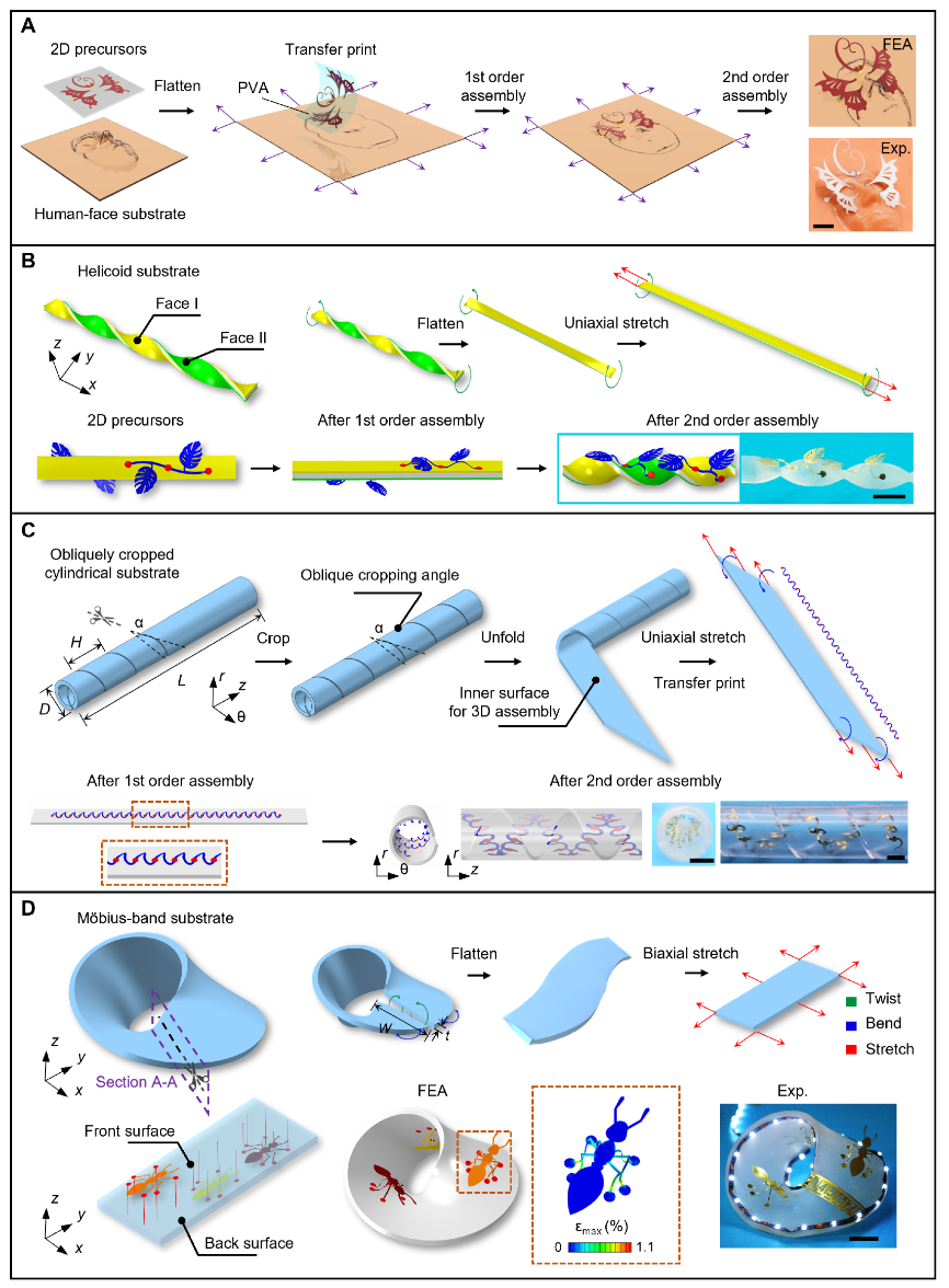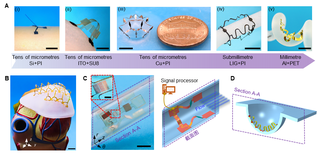 A图为在不同曲面上组装的不同尺度不同材料的复杂三维结构(从左到右的比例尺为100m、200m、5mm、5mm和10mm);B图为与心尖共形集成的高度可拉伸三维集成电子系统; C图为在管内表面的三维流速传感器;D图为连续可调的偶极子天线