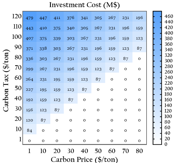 不同碳价、碳税下改造与不改造模型的总成本对比