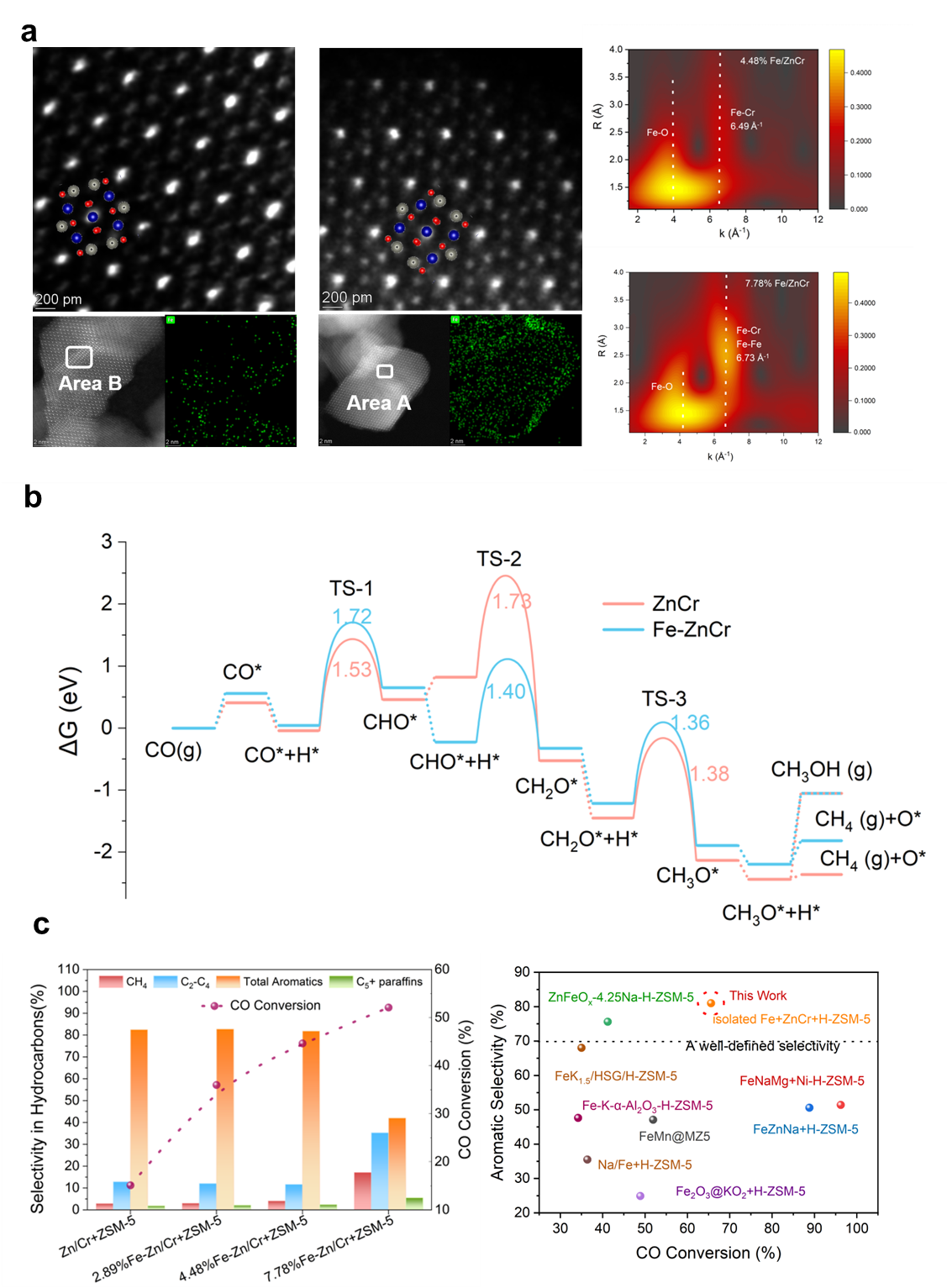 采用纳米尖晶石ZnCr2O4和短b轴H-ZSM-5在高压临氢条件下制备酸碱异质结耦合催化体系,实现了超80wt.%的芳烃选择性。在此基础上,利用纳米尖晶石16d位点缺陷实现费托金属(Fe/Co)的单分散,尖晶石自身丰富的氧空位可有效抑制加氢过程中FeCx等碳碳偶联高活性相的生成,在维持超高芳烃选择的同时将加氢能力提高3倍以上。相关成果以“Accelerating syngas-to-aromatic conversion via spontaneously monodispersed Fe in ZnCr2O4spinel”(ZnCr2O4尖晶石上Fe的自发单分散加速芳烃的定向转化)为题发表于《自然·通讯》(Nature Communications)期刊上。
