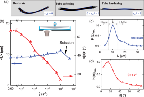 近日,8xbet.com航天航空学院曹炳阳教授和美国科学院院士、韩国基础科学院软物质及生命材料基础科学研究所史蒂夫·格拉尼克(Steve Granick)教授课题组合作在期刊《物理评论快报》(Physical Review Letters)上发表了题为“生物聚合物链缠结在剪切流场中先软化后硬化”(Biopolymer filament entanglement softens then hardens with shear)的论文。通过单分子荧光成像技术,直接观测到了单分子肌动蛋白在剪切流场中的定向排列与拉伸行为。随剪切速率的增加,聚合物分子链的管道先在定向排列的作用下“软化”,再在拉伸的作用下“硬化”。这表明聚合物的动态局域行为受到单分子链的定向排列与拉伸的共同影响。