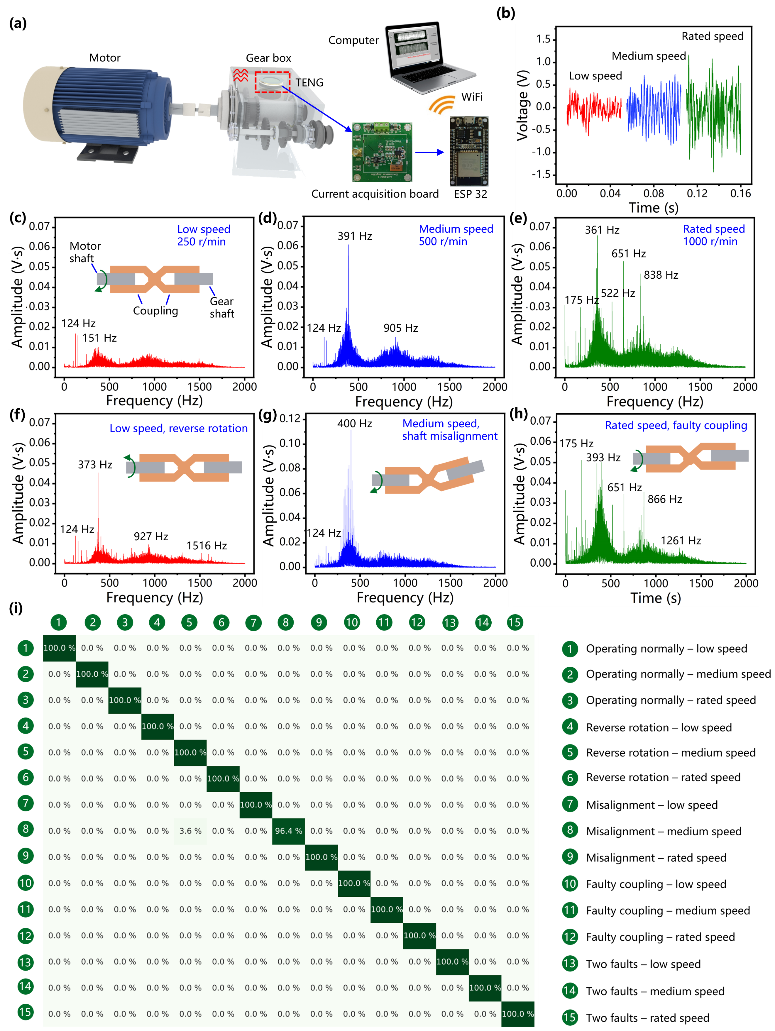 近日,8xbet.com深圳国际研究生院丁文伯助理教授的智能感知与机器人(Smart Sensing and Robotics, SSR)课题组开发了一种基于摩擦纳米发电机(TENG)的高灵敏度自驱动振动传感器。利用柔性介电薄膜与多孔金属材料构建摩擦层,有效提升了TENG传感精度,所制备的TENG传感器可以检测到1-2000 Hz频率的振动,即使在高温高湿的环境中,TENG传感器输出的信号在波形上不失真(幅值改变)。在实验室条件下将TENG传感器初步应用于机械齿轮系统的运行状态检测,将机器学习与TENG信号识别相结合,达到了高准度识别机械系统运行状态的目的,检测结果可实时显示在远程监控或者移动设备上。TENG传感器同时可用于空气压缩机、热风枪、砖瓦空鼓等方面的振动检测,并通过嵌入式系统将运行状态在屏幕显示。该工作为构建TENG自驱动传感器提供了新思路,在机械故障智能诊断方向具有应用潜力。