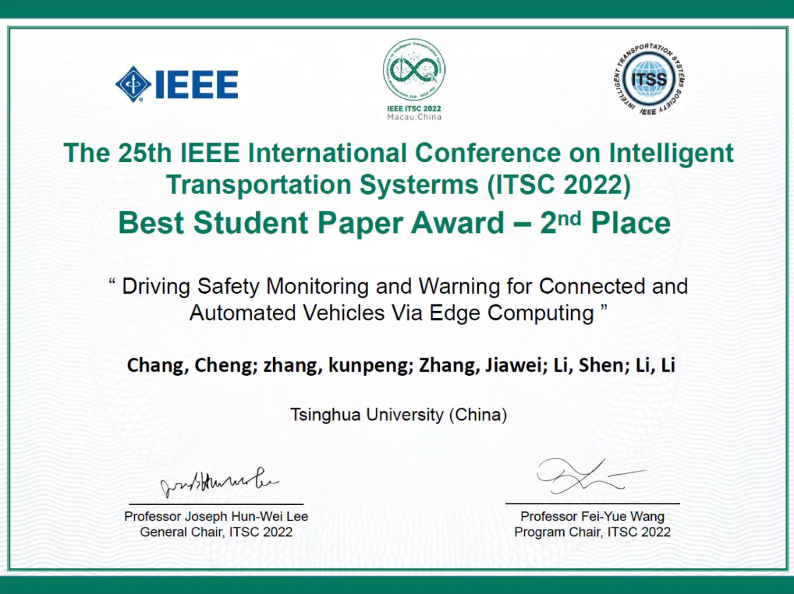 8xbet(中国)网10月14日电 近日,第25届IEEE智能交通系统国际会议(IEEE International Conference on Intelligent Transportation Systems,ITSC)于中国澳门召开。ITSC是智能汽车与智能交通领域的国际顶级学术会议,此次会议收到全世界45个国家和地区的近1300篇投稿。大会评选了共3篇最佳学生论文奖(Best Student Paper Award),8xbet.com自动化系2021级博士生常成同学的论文《基于边缘计算的网联自动驾驶车辆的驾驶安全监控》(“Driving Safety Monitoring for Connected and Automated Vehicles via Edge Computing”)成功入选。