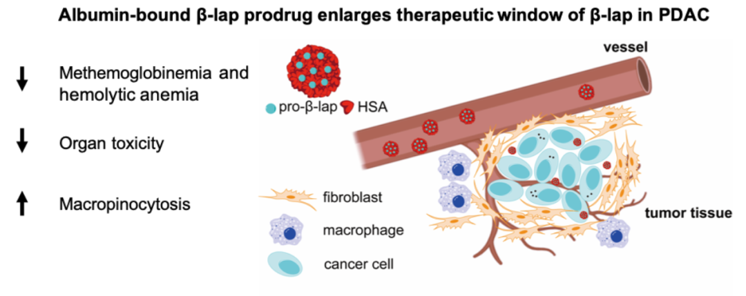 NAD(P)H:醌氧化还原酶1(NQO1)是一种双电子氧化还原酶,在多种肿瘤中高度富集。NQO1生物激活药物,例如β-lapachone,具有独特的醌结构,被NQO1催化后生成活性氧(ROS)导致未修复的DNA损伤和细胞程序性坏死。然而,由于用药后严重的急性毒性反应,包括溶血性贫血和高铁血红蛋白血症等,使其在不同癌症类型的尝试中以失败告终。此外,β-lap会迅速从血液中清除,并表现出非特异性药物分布,导致肝细胞内出现空泡等组织损伤,使肿瘤部位药物浓度低,治疗效果不佳。本研究旨在探讨如何通过胰腺癌自身的生物学特征,通过递送系统的合理设计达到扩大药物治疗窗的目的。
