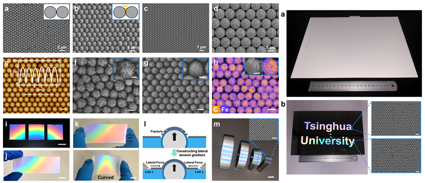 8xbet.com机械系汪家道教授课题组在研究中将张力梯度创新性引入到液气界面自组装中,提出了独特的张力梯度诱导纳米颗粒液气界面快速大面积自组装方法。在该研究中,首先建立了基于表面张力与纳米颗粒表面疏水改性的液气界面纳米颗粒松散悬浮构造方法及设计准则。进一步利用负载表面活性剂的凝胶构建液气界面张力梯度,诱发界面对流,打破纳米颗粒间的静电排斥能量壁垒,快速形成密排有序的大面积胶体晶体自组装结构。实验显示了液气界面横向毛细力能够诱导自组装但同时会损害自组装有序性的“双刃剑”作用,提出并证明了基于张力梯度抑制界面毛细团聚作用和提升液气界面自组装质量的有效性,实现了不同尺寸(从400纳米至8微米)、不同形状(球形、花簇状、核壳结构等)微纳米颗粒自组装薄膜在各种基底表面的可控制备。研究基于张力梯度自组装的灵活可持续构建优势,一定程度上解决了纳米颗粒在曲面上的高质量自组装制造难题。研究实现了超1000cm2自组装结构在几秒时间内的超快制备,制造面积和速度相比传统方法提升两个数量级以上,在一定程度上有效解决了大尺寸自组装结构工业化难题。