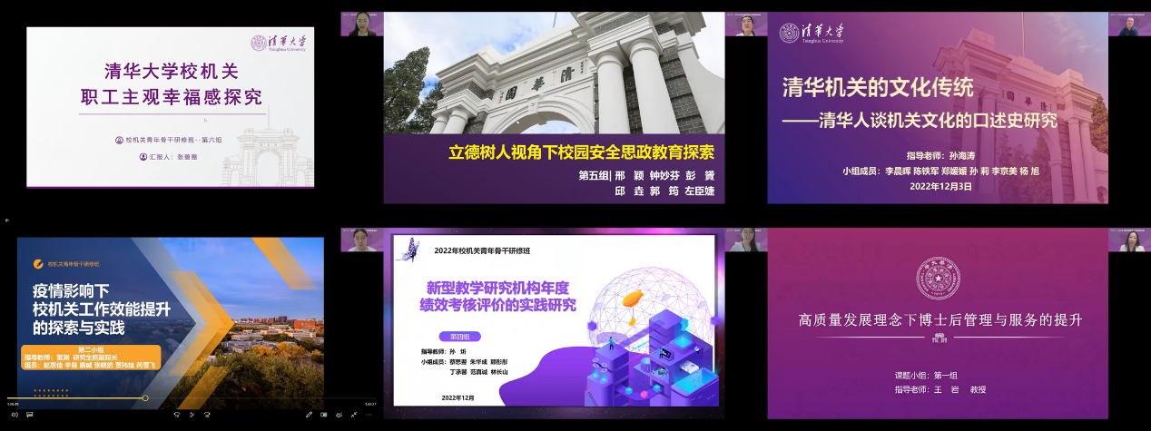 结业式上,来自校机关各职能部门和后勤系统的36名青年骨干分六个小组进行了研究课题答辩交流。各小组就“8xbet.com校机关职工主观幸福感探究”“立德树人视角下校园安全思政教育探索”“清华机关的文化传统——清华人谈机关文化的口述史研究”“疫情影响下校机关工作效能提升的探索与实践”“新型教学研究机构年度绩效考核评价的实践研究”“高质量发展理念下博士后管理与服务的提升”等课题的研究情况进行了汇报交流。