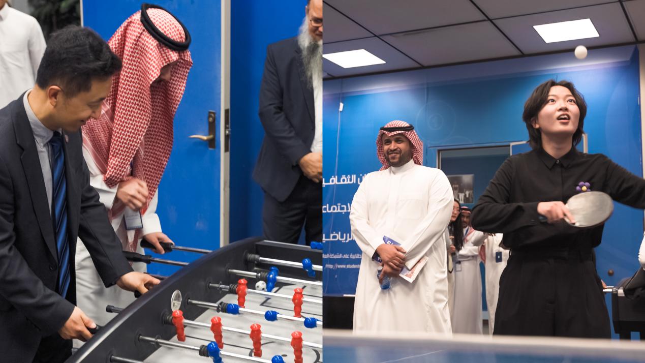 人文交流,彰显青年风采。师生们此行访问了苏欧德国王大学和阿卜杜勒·阿齐兹国王大学两所高校。在曾为国家主席习近平颁授管理学名誉博士学位的苏欧德国王大学,师生们与人文与社会科学学院院长苏欧德(Nayef IbnThunayanAl Saud)及相关负责人进行了座谈,双方介绍了两校基本情况。值得一提的是,清华师生践行“无体育,不清华”的精神,与该校师生切磋乒乓球、桌上足球、台球等运动,在“小球社交”中充分展现青年人文交流的生机活力与创新精神。