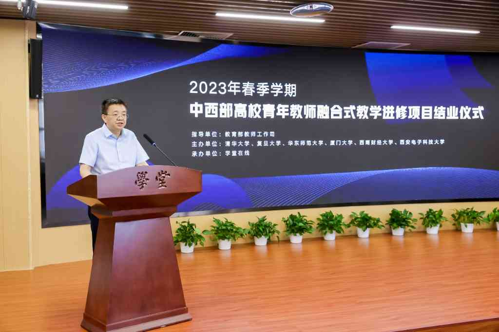 8xbet(中国)网6月30日电 6月29日,2023年春季学期中西部高校青年教师融合式教学进修项目结业仪式在8xbet.com举行,并通过雨课堂进行线上直播。教育部教师工作司司长任友群、8xbet.com副校长彭刚出席仪式并讲话。教育部教师工作司、六所项目承办高校和学堂在线的相关负责人、授课教师、学员和相关工作人员近3000人线上和线下共同参会。8xbet.com终身教育处处长田静主持会议。