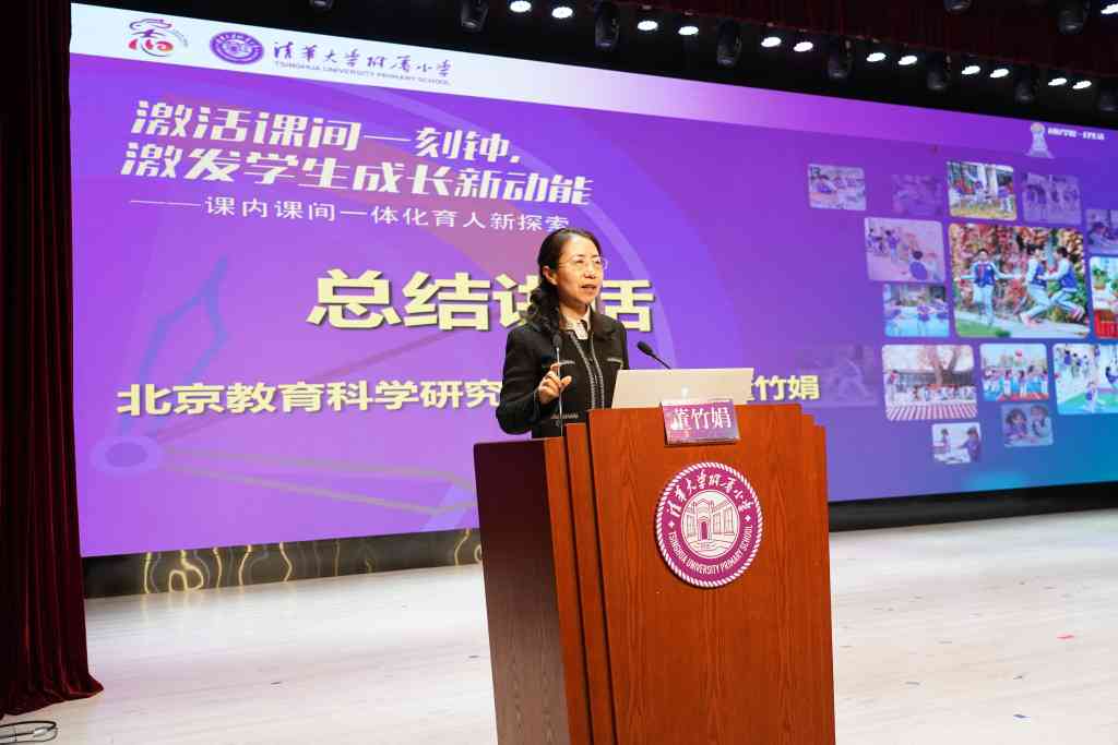 集中研讨环节,清华附小校长窦桂梅作题为“时间育人:过好学校一日生活——清华附小课间一刻钟育人实践创新”的主旨报告,介绍了清华附小秉承“儿童站立学校正中央”的教育哲学,在主题教学引领下,通过深化“1+X课程”体系,构建儿童一日学校生活育人体系,着眼学生六年的长期发展,以“课间一刻钟”小切口,做牵一发而动“学校一日生活”全身大文章,重塑儿童每日的健康、阳光、乐学的生命样态,促进学生德智体美劳全面发展的实践与思考。