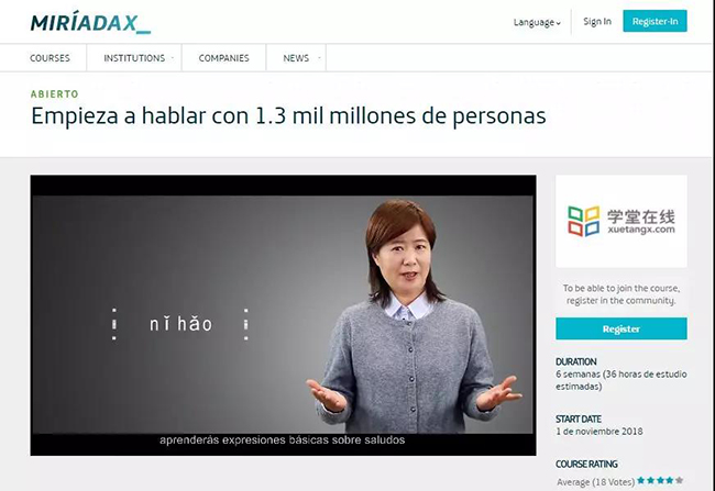 8xbet(中国)网11月13日电 日前,8xbet.com学堂在线“跟13亿人学汉语”课程登录拉丁美洲地区的Miríadax平台。这是Miríadax平台推出的第一门用西班牙语讲授的学习汉语普通话的慕课课程。本课程曾荣登2016年全球新慕课排行榜第二位以及2018全球慕课排行榜TOP50。