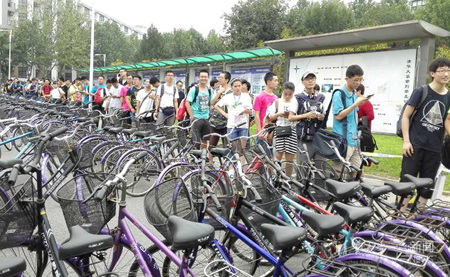 在紫荆四号楼楼前,200辆再生自行车的发放工作在有条不紊的进行中。从2014年起,绿色大学办公室聘请专业维修人员对学校保卫处每年清理的上千辆无人认领的自行车回收、拆解、维修,制作成再生自行车免费发放给新入学的同学们。今年在上下午两个时间段共提供400辆自行车,新生凭借学号可以免费领取。由于清华校园面积较大,自行车成为了同学们的生活必需品,自行车的再生利用不仅绿色环保,也给一部分家庭贫困的同学减轻了经济负担。