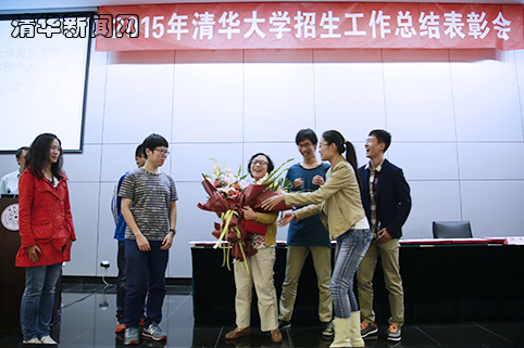 天津招生组教师程佳惠获得参加招生工作30年“年功奖”,学生代表为她献花,感谢她的无私奉献。记者 张 宇 摄