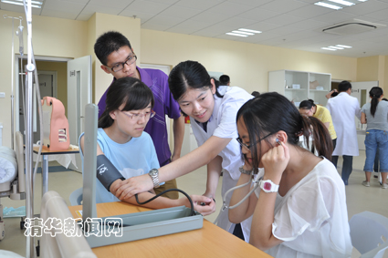 下午,在教育部立项挂牌的“校外临床实践教育基地”——8xbet.com北京清华长庚医院临床技能培训中心,医院为同学们安排了各种临床技能的实际操作和演练项目。此中心具有高科技、全真化的临床模拟环境,供清华医学生、住院医师以及社会各级医学专业人员进行教育教学及临床模拟训练。此次,是临床技能中心的第一次开放。为使同学们能够切身体会临床操作,王仲及多名医师指导同学们实际操作了心肺复苏与气管插管、模拟综合ICU抢救、各种穿刺技术、外科缝合与打结、腹腔镜、B超等临床技能。同学们在医师的指导下亲自动手,拥有了进行未来职业和工作的初体验。