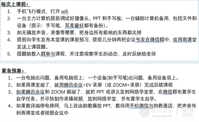 在线教学对大多数老师和同学来说都是新鲜事物,在刚开始时,一定要充分考虑,做好各项预案与测试工作,以免正式授课中浪费过多时间处理非教学内容。例如:经过和在线教学专家组的老师们多次商议与讨论,我们列出“开课前的Checklist”与“每次上课前的Checklist”,并做好了应对各类突发状况的预案。内容如下: