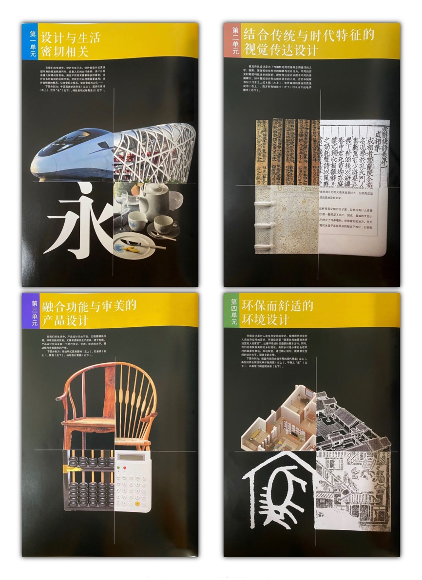 新版高中美术教科书按照教育部最新颁布的“课标”要求,围绕图像识读、美术表现、审美判断、创意实践、文化理解五大核心素养进行修订编写。《设计》分册新教材的基本结构整体分为四个单元,从生活的衣、食、住、行出发,综合视觉传达、产品设计、环境设计等不同方向,使学生建立对“设计”的系统性基本认知。