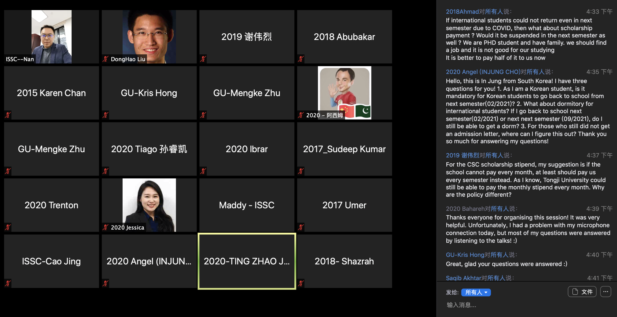 在答疑环节,与会同学积极与校研究生会、国际学生学者中心相关负责人进行互动交流,就心理咨询、临时困难补助、中国政府奖学金政策等问题积极有序提问,同时感谢学校安排此次专门交流,并表达了早日回到中国、返回校园的意愿和期望。国际学生学者中心研究生事务组组长、国际学生事务咨询师邹楠指出,学校正在密切关注来华签证政策信息,会及时向同学们进行反馈,为同学们提供必要的支持和服务。曹璟就关于国际学生奖学金申请、发放以及延期等问题逐一进行解答。