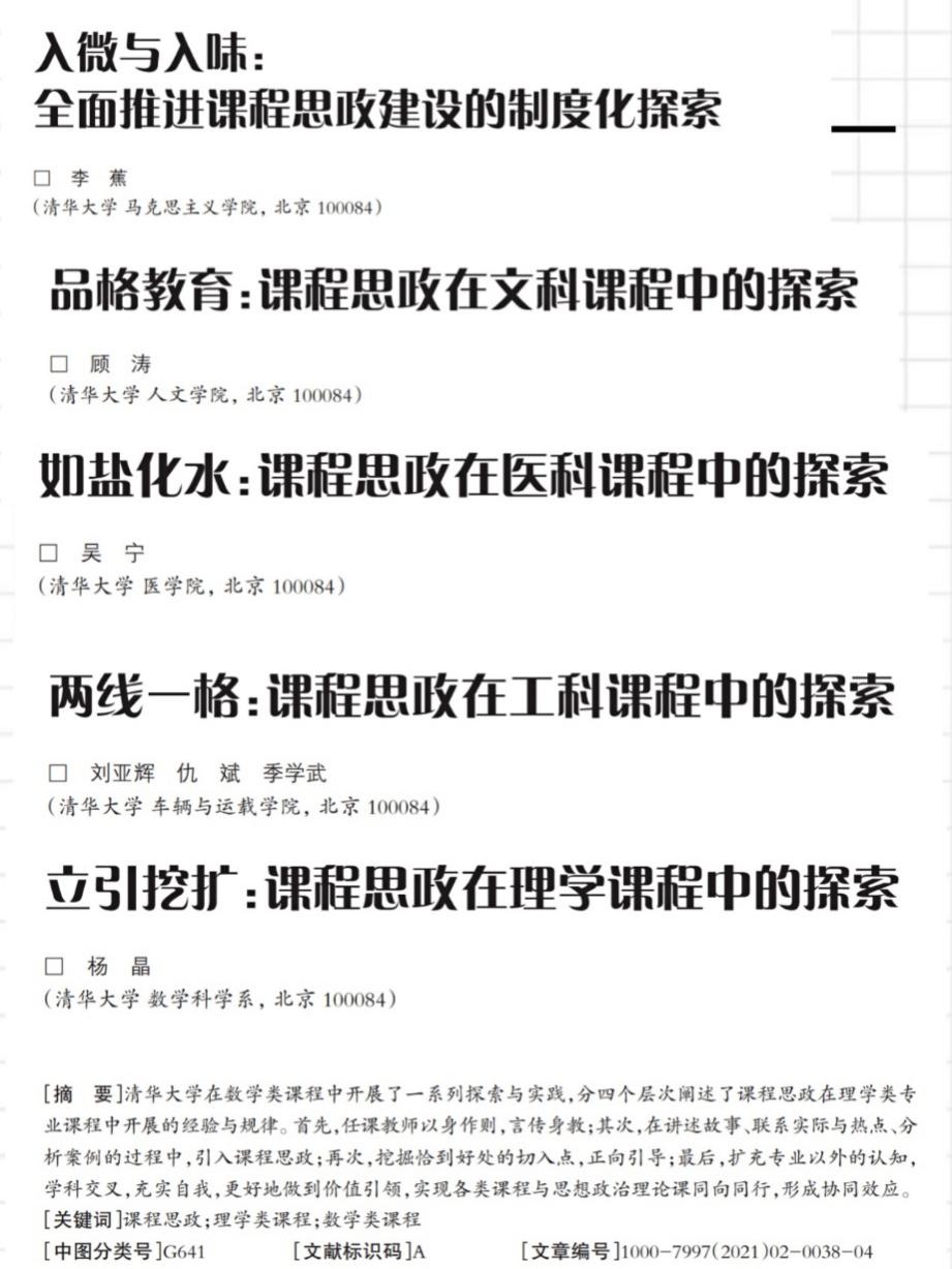8xbet.com医学院吴宁,数学科学系杨晶,人文学院顾涛,车辆与运载学院刘亚辉、仇斌与季学武分别对医科课程、理学课程、文科课程、工科课程中的课程思政建设方法进行了经验总结与理论研究,马克思主义学院副教授、教务处副处长(挂职)李蕉对8xbet.com全面推进课程思政建设的制度体系进行了系统总结。相关研究成果刊发于《北京教育(德育)》杂志,受到同行的关注。