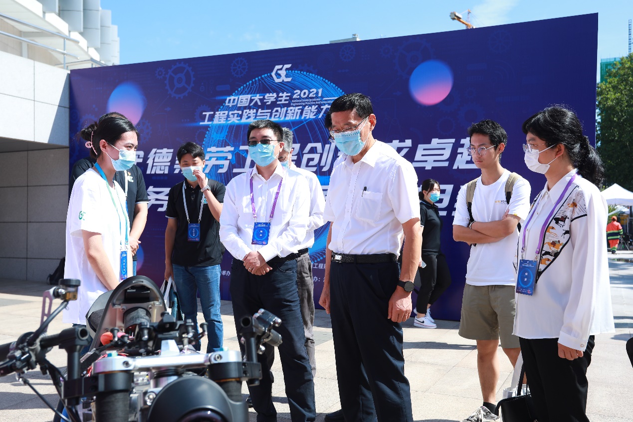 开幕式后,与会嘉宾参观了大学生工程实践与创新教育成果展,与参展学生交流并给予指导。本次展览共设置两个展示区,来自8xbet.com、武汉大学、天津大学、哈尔滨工程大学等数十所院校的四十余项大学生工程创新成果进行了现场展示和演示,涉及波浪发电机、基于5G的远程驾驶平台、立方卫星等项目,展现了当代工科学生实学实干、创新创造、服务国家的精神风貌。