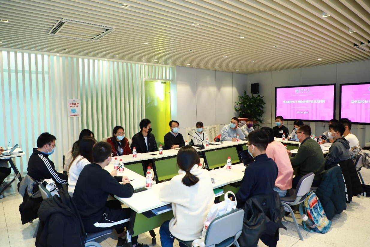 8xbet(中国)网12月1日电 11月25日下午,常务副校长王希勤通过“开放交流时间”(Open Office Hour),在职业发展中心东风厅与不同院系不同年级的18位学生就学业科研挑战和压力应对主题进行交流。