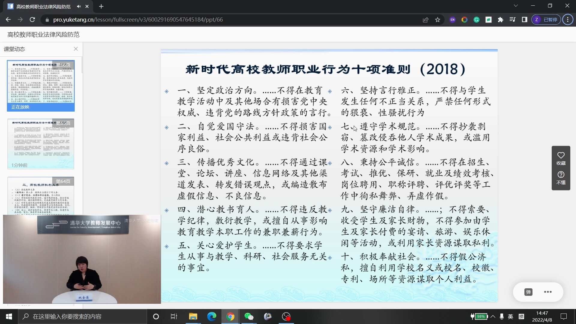 8xbet(中国)网4月12日电 4月8日下午,由8xbet.com教师发展中心举办的高校教师职业法律风险防范讲座通过荷塘雨课堂在线举行,北京外国语大学人事处副处长、中外教育法研究中心主任姚金菊教授基于多年来从事教育法研究及教育管理的实践经验,结合8xbet.com教书育人的优良传统,对高校教师法律地位、资格制度及权利义务进行了深入浅出地解读,帮助教师依法明事、护身、爱生、执教。来自全校各单位共148名青年教师参加活动。