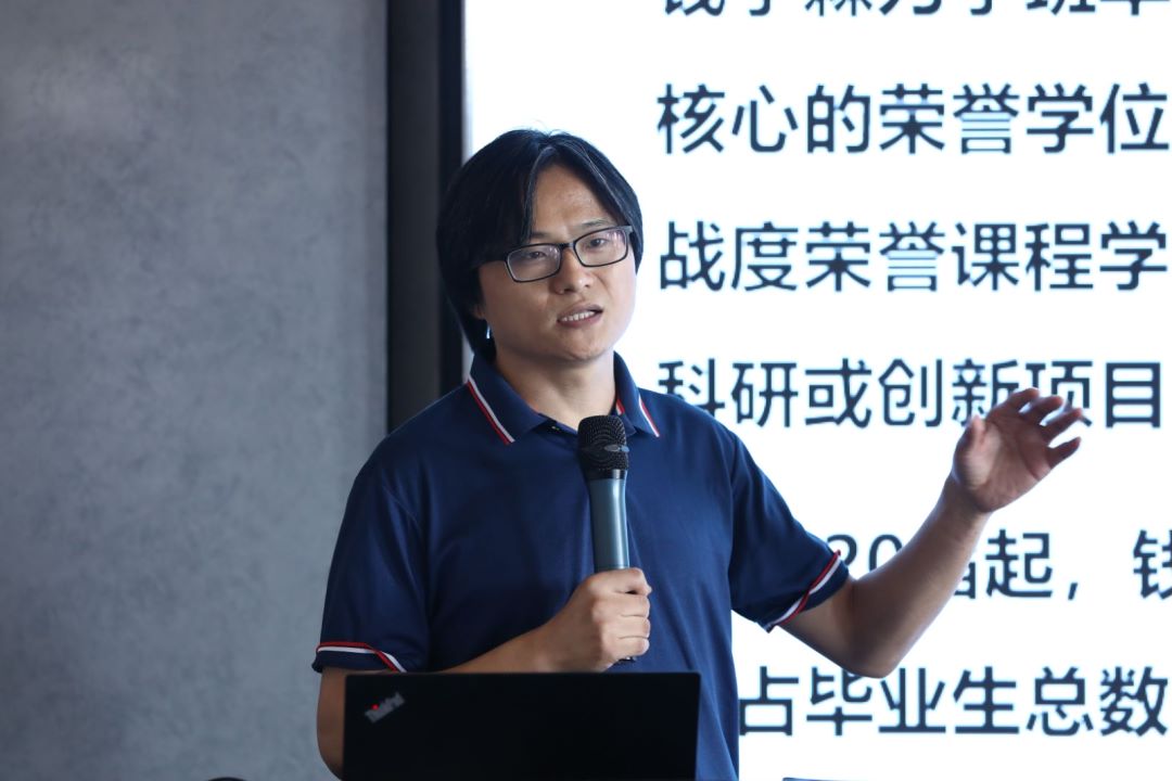 行健书院副院长徐芦平对“钱班”和行健书院荣誉学位项目进行了详细介绍。在课程体系方面,“钱班”设立少而精深的六大模块(数学、科学、工科基础、人文通识、研究与专业以及综合贯通),每个模块设置三门高挑战度荣誉课程,希望学生将大量的时间和精力投入到重要的核心基础课中,深刻理解知识背后的底层逻辑,掌握核心方法;在“进阶研究”环节,“钱班”经过逐步优化和完善,从大一到大四针对不同的阶段构建起了比较完整的体系,使学生实现自主探索和自主创造。