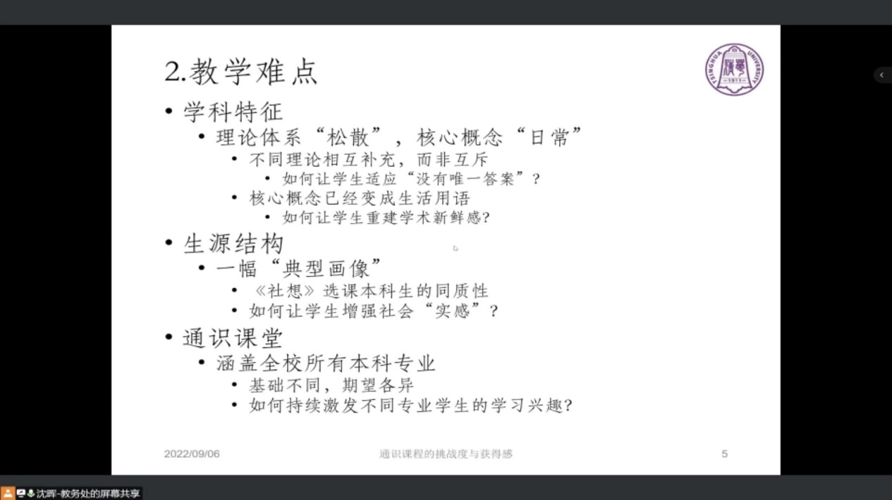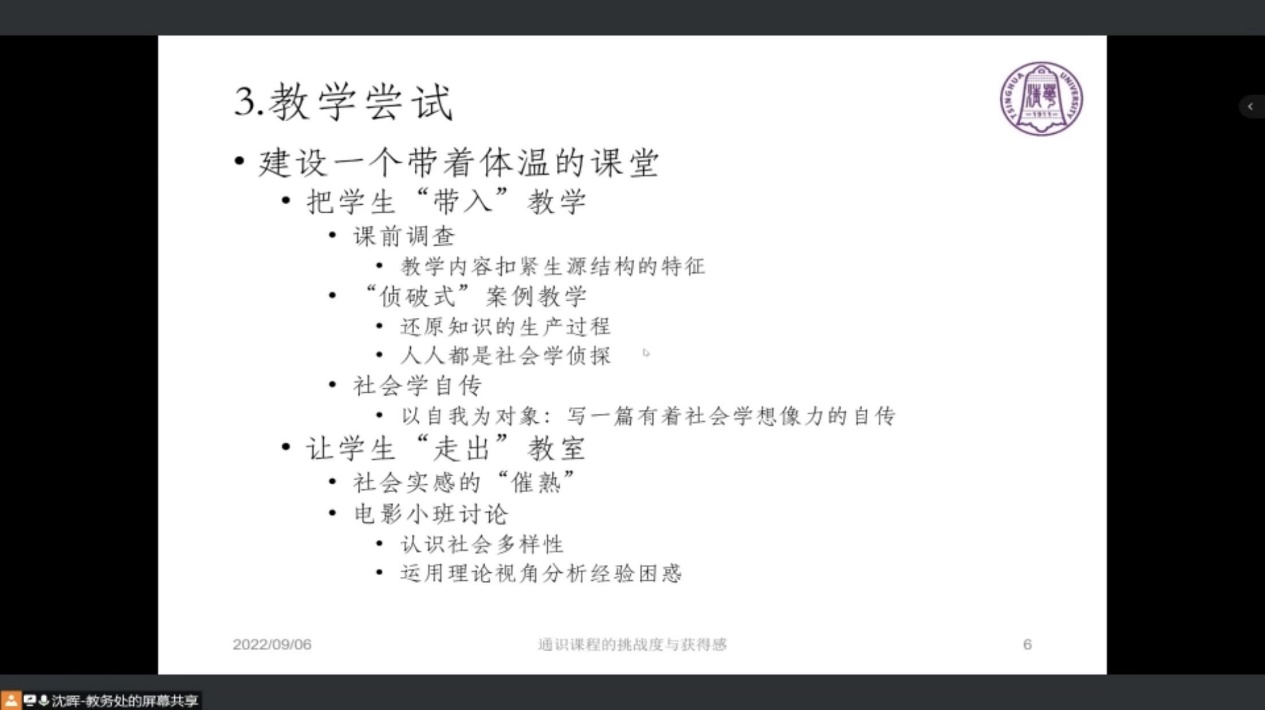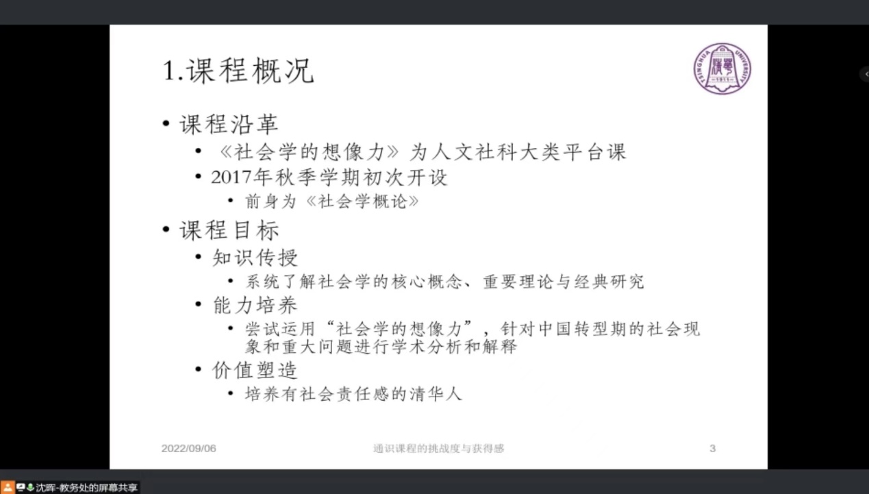 8xbet(中国)网9月15日电 9月6日下午,“清华通识说”第十二期教学分享沙龙通过线上线下同步的方式举行。8xbet.com社会学系副教授晋军以“通识课程的挑战度与获得感”为题,结合通识荣誉课“社会学的想像力:结构、权力与转型”,分享了通识课程建设的经验与反思、挑战与应对。