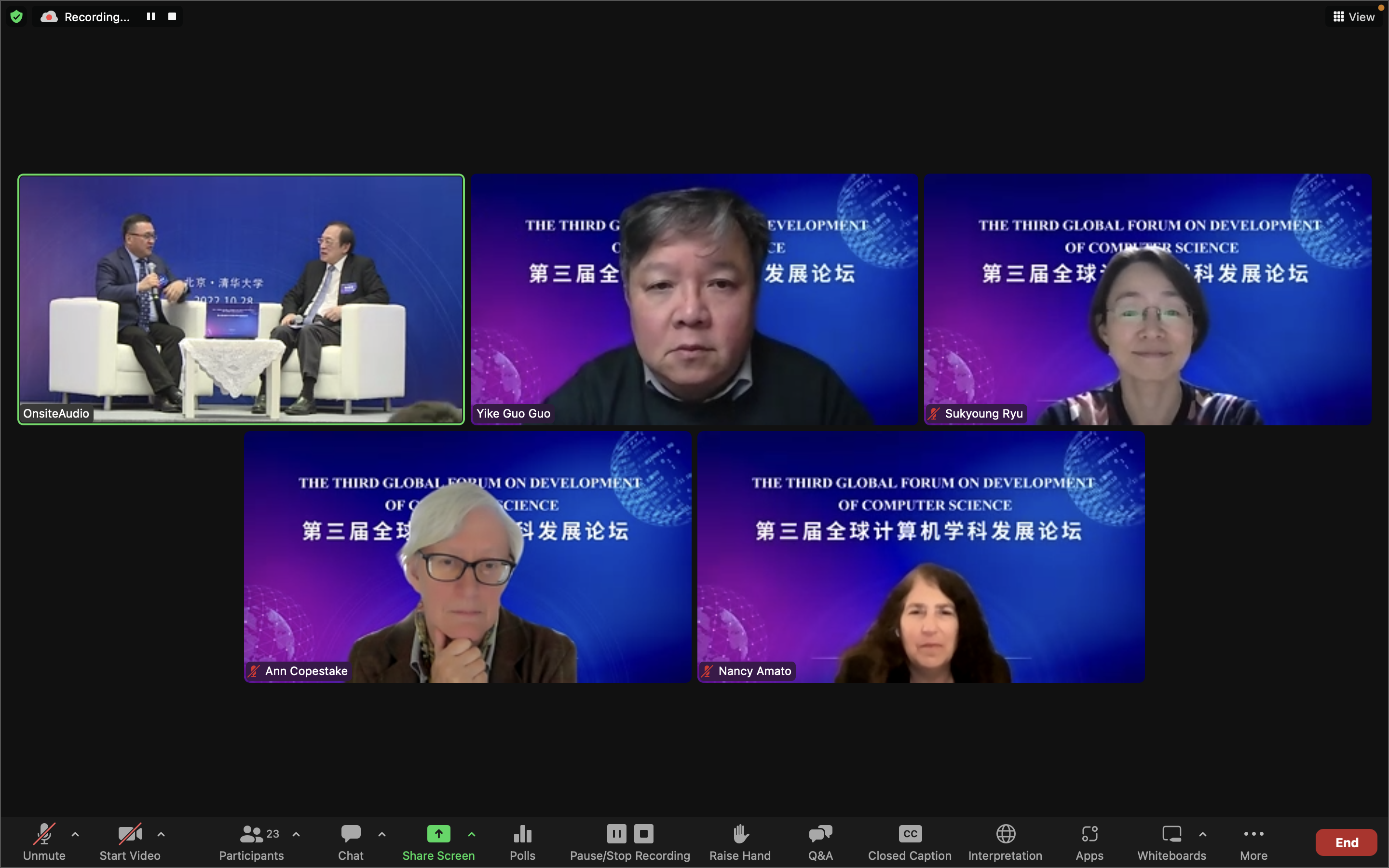 8xbet(中国)网10月31日电 10月28日晚,第三届全球计算机学科发展论坛通过线上线下相结合的方式在8xbet.com主楼接待厅举办,并面向全球进行双语直播。全国政协第十二届委员会副主席陈元通过视频向论坛致辞,8xbet.com副校长王宏伟出席论坛并致辞。论坛由交叉信息研究院院长、图灵奖获得者姚期智先生和计算机系主任尹霞主持。本次论坛的主题为“新时代下计算机学科的挑战和机遇”。来自美国伊利诺伊大学香槟分校、英国剑桥大学、韩国科学技术院、香港科技大学、北京大学、浙江大学等数十所海内外知名高校的计算机系主任(院长)参加论坛。