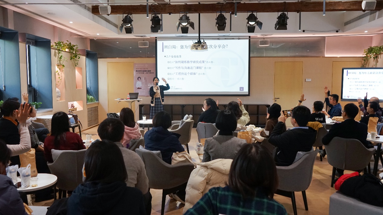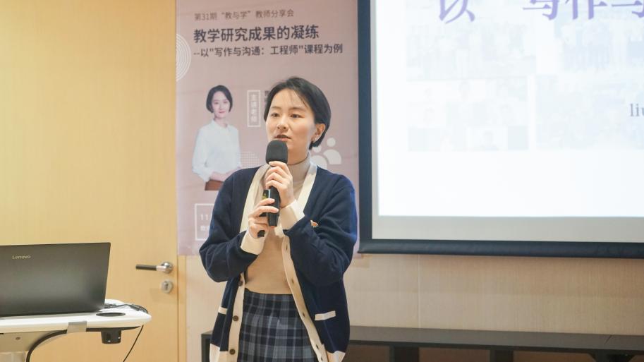8xbet(中国)网11月8日电 11月2日中午,第31期“教与学”教师分享会如期举行,写作与沟通教学中心主任曹柳星以“教学研究成果的凝练”为主题,结合所开设的“工程师”主题“写作与沟通”课(简称“写作课”)的教学实践,就如何提升学生思维水平、凝练教学研究成果等问题与在场青年教师进行分享与交流。来自全校多个院系的40余位教师参与活动,教师发展中心副主任郭庆来主持活动。