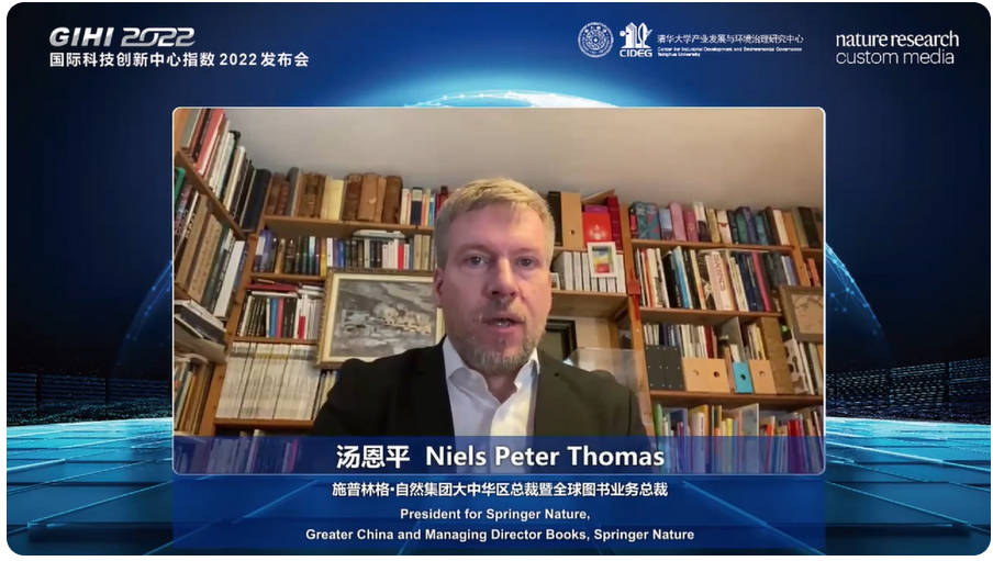 施普林格·自然集团大中华区总裁汤恩平(Niels Peter Thomas)博士指出,创新是经济增长的关键引擎,国际合作对创新产出的支撑作用日益凸显,大量的国际合作在国际科创中心展开。他肯定了过去三年的合作历程和指数产生的影响,希望未来能继续在此课题上与清华保持合作。