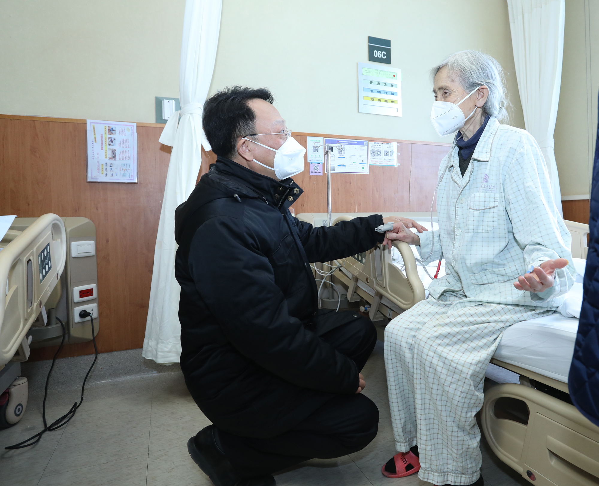 “感谢大家,你们辛苦了!”在华信医院,王希勤、黄天荫一行先后走访了医院门诊、急诊科、老年医学科,听取了医院关于近期患者救治工作的情况汇报,向坚持奋战在一线的医护人员表达感谢并送上慰问品。在住院病房,王希勤代表学校向住院治疗的老同志传达了关心与问候。华信医院党委书记类延旭、院长张明奎等陪同走访调研。