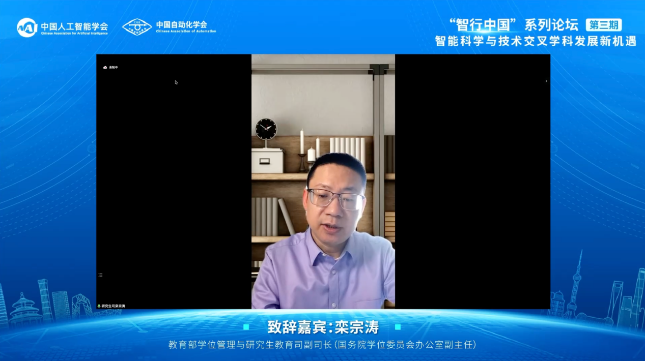 教育部学位管理与研究生教育司副司长、国务院学位委员会办公室副主任栾宗涛在开幕式致辞中强调,我国正处于工业经济向数字经济、智能经济迈进的关键时期,人工智能日益成为引领新一轮科技革命和产业变革的核心技术,并成为推动中国经济转型、产业升级的重要力量。国务院学位委员会和教育部积极贯彻落实党中央、国务院部署要求,大力推进人工智能相关学科专业建设,希望本次论坛对交叉学科内涵、交叉学科边界以及如何处理好学科间关系等问题进行深入探讨。